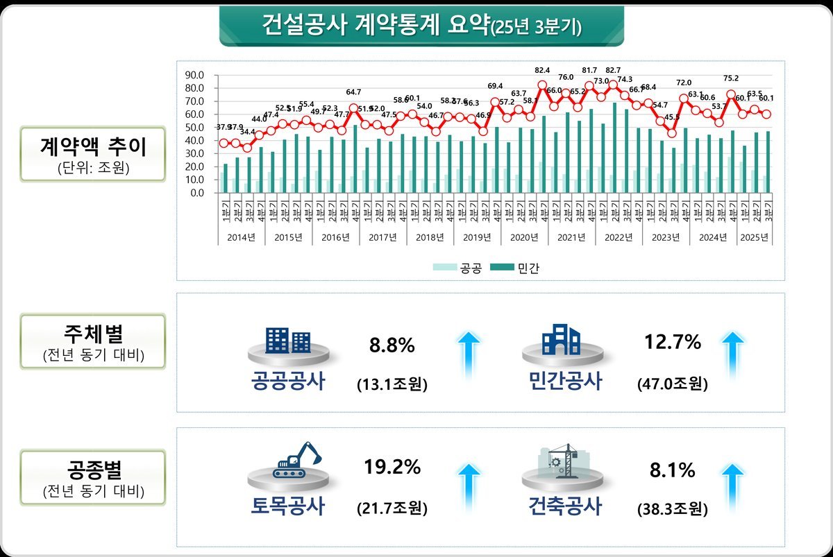 [충청25시] 국토교통부는 ’25년 3분기 건설공사 계약액이 전년 동기 대비 11.9% 증가한 60.1조 원을 기록하였다고 밝혔다.