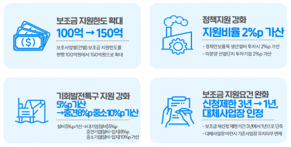 또한, 급변하는 글로벌 산업환경에 대응하고 핵심 산업의 공급망 안정을 지원하기 위해 공급망안정화 지원 기본법에 따른 경제안보품목·서비스 생산설비에 투자하는 선도사업자에게 설비보조금 지원비율을 2%p 가산하고 장기 미분양 산업단지 투자기업에 대한 설비보조금 지원비율도 2%p 가산한다.