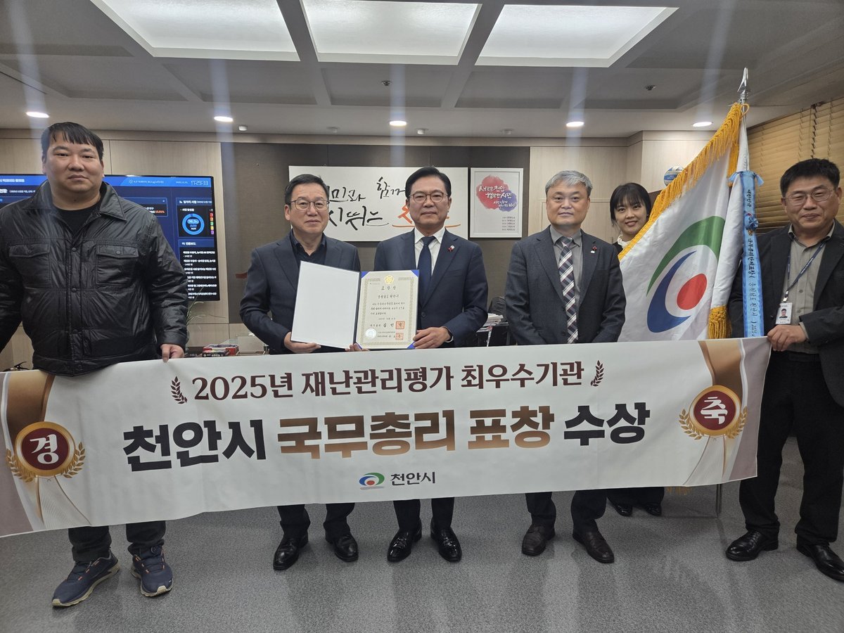 [충청25시] 천안시가 행정안전부 주관 ‘2025년 재난관리평가’에서 우수기관에 선정돼 국무총리 표창을 받았다고 23일 밝혔다.
