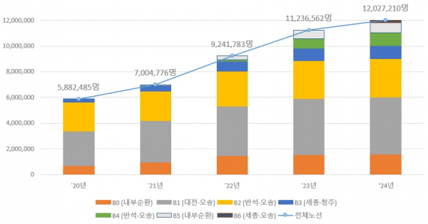 [충청25시] 2024년 행복도시권 간선급행버스체계 ‘바로타’ 연간 이용객수가 2020년 589만명 대비 2배 이상 증가한 1203만명을 기록했다.