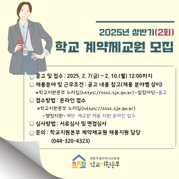 [충청25시] 세종시교육청학교지원본부은 휴직 등으로 발생하는 교원의 결원 대체 인력을 채용하기 위해 2025학년도 상반기 학교 계약제 교원을 모집한다.