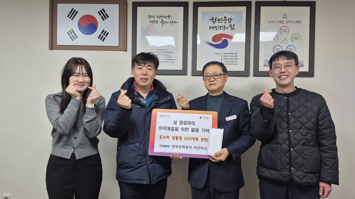 [충청25시] 한국전력공사 서산지사에서는 10일 직원들이 자발적으로 월급의 일부를 모아 조성한 러브펀드로 설 명절을 맞아 서산시종합사회복지관에 100만원 상당의 온누리상품권을 기부해 지역사회의 어려운 이웃에게 따뜻한 마음을 전했다.