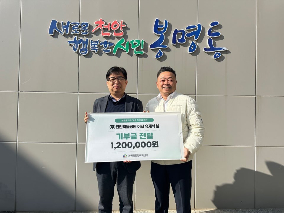 [충청25시] 천안시 봉명동은 유재석 ㈜천안하늘공원 이사가 취약계층을 위한 후원금 120만원을 기탁했다고 2일 밝혔다.