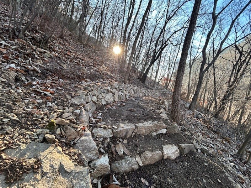 이번 사업에 약 2억 원이 투입됐으며 산책로 이용객들의 안전사고 예방과 자연 친화적 산책로 조성을 위해 노면을 고르게 정비하고 방향안내판, 안전로프난간, 돌계단, 돌배수로 등을 설치했다.