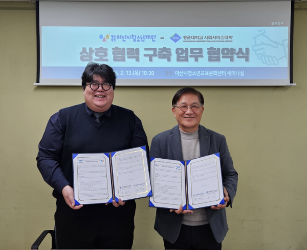 [충청25시] 아산시청소년재단은 12일 청운대학교 청소년상담교육학과와 상호협력을 위한 업무 협약을 체결했다고 밝혔다.