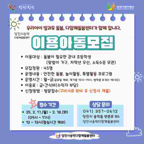 [충청25시] 당진시는 맞벌이 가정 등 초등학생 돌봄이 필요한 가정을 위해 당진시송악다함께돌봄센터 이용아동을 모집한다고 14일 밝혔다.