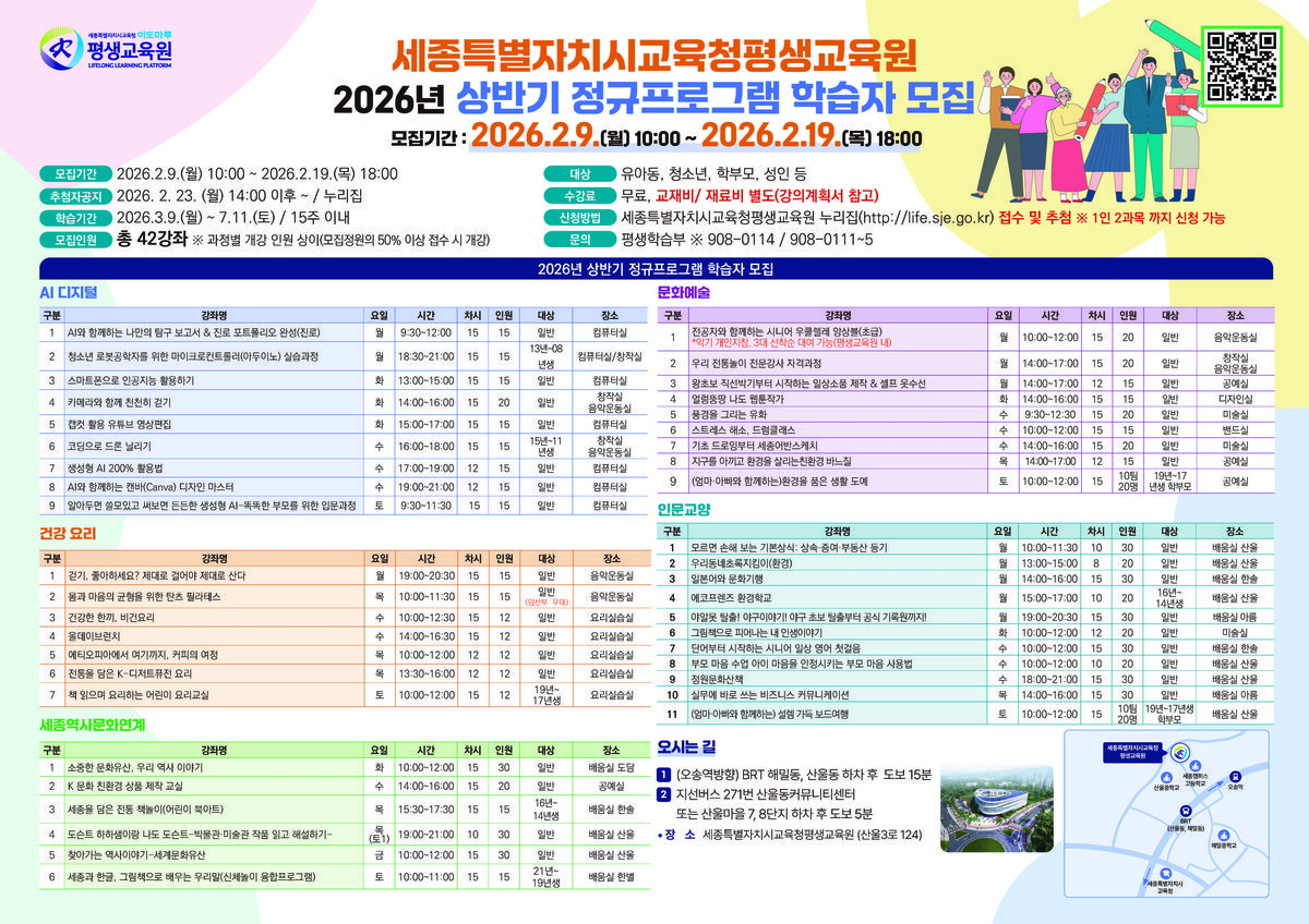 먼저, 시민 수강생은 2월 9일부터 모집하며 인공지능·디지털, 세종역사문화, 인문교양 등 다채로운 강좌를 통해 일상 속 배움으로 삶의 질을 높일 수 있도록 구성했다.