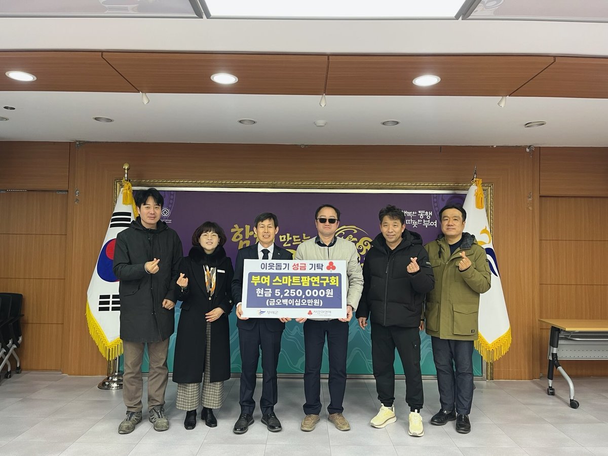 부여군청 김지태 문화체육복지국장은 “따뜻한 나눔을 실천해 주신 스마트팜연구회 회원들께 깊이 감사드린다”며 “기탁해 주신 성금은 도움이 필요한 분들께 정성껏 전달하겠다”고 전했다.