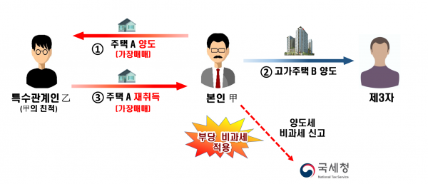 2주택자가 친척 등에게 주택 한 채를 서류상으로만 허위 이전한 다음, 가격이 급등한 다른 한 채에 대해 1세대1주택 비과세를 적용해 양도하는 방식 등 가장매매를 이용한 탈루혐의자가 다수 확인됐다.