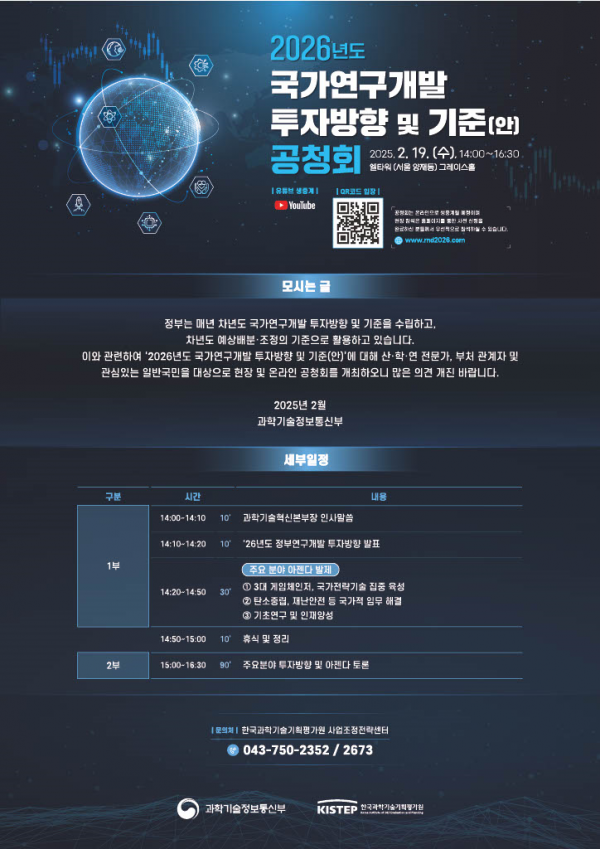 공청회 1부에서는 대내외 투자환경, ’ 26년 정부 연구개발 투자 의제 등을 담은 ’ 26년도 투자방향에 대한 발표가 있을 예정이며 2부에서는 현장·연구자 참여하는 토론 및 질의응답이 진행된다.
