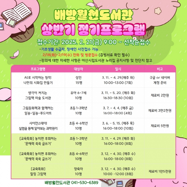 [충청25시] 아산시 배방월천도서관이 오는 3월부터 6월까지 시민의 독서 분위기 조성과 삶의 질 향상을 위해 ‘상반기 독서문화 프로그램’을 운영한다.