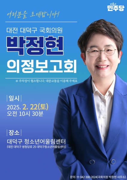 [충청25시] 더불어민주당 박정현 국회의원이 22일 오전 10시 30분, 대전 대덕구 청소년어울림센터에서 의정보고회를 개최한다고 밝혔다.