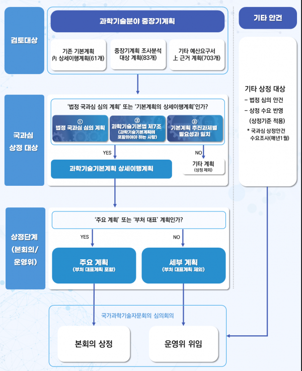 국가과학기술자문회의 심의회의 산하 운영위원회와 특별위원회 등을 총괄 운영하는 과학기술혁신본부는 각 부처에서 수립하는 중·장기 과학기술정책 간의 정합성을 확보해 부처간 협업체계를 강화하고 이를 통해 안정적이고 전략적인 연구개발 투자가 가능하도록 하기 위해 과학기술분야 최상위 계획인 ‘ 과학기술기본계획’과 정합성을 기준으로 기본계획의 상세이행계획이 되는 각 부처 과학기술분야 중장기계획을 분류해 국과심 상정 대상을 확정했다.