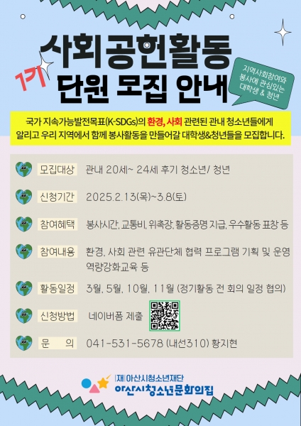 [충청25시] 아산시청소년재단 산하 아산시청소년문화의집은 지역사회의 다양한 문제를 해결하고 자원봉사 문화를 확산하기 위한 사회공헌활동을 기획하고 운영할 1기 단원을 3월 8일까지 모집한다.