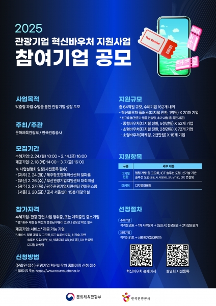 [충청25시] 문화체육관광부와 한국관광공사는 중소 관광기업의 혁신 성장을 위해 2월 24일부터 3월 14일까지 ‘2025 관광기업 혁신바우처 지원사업’의 수혜기업을 모집한다.