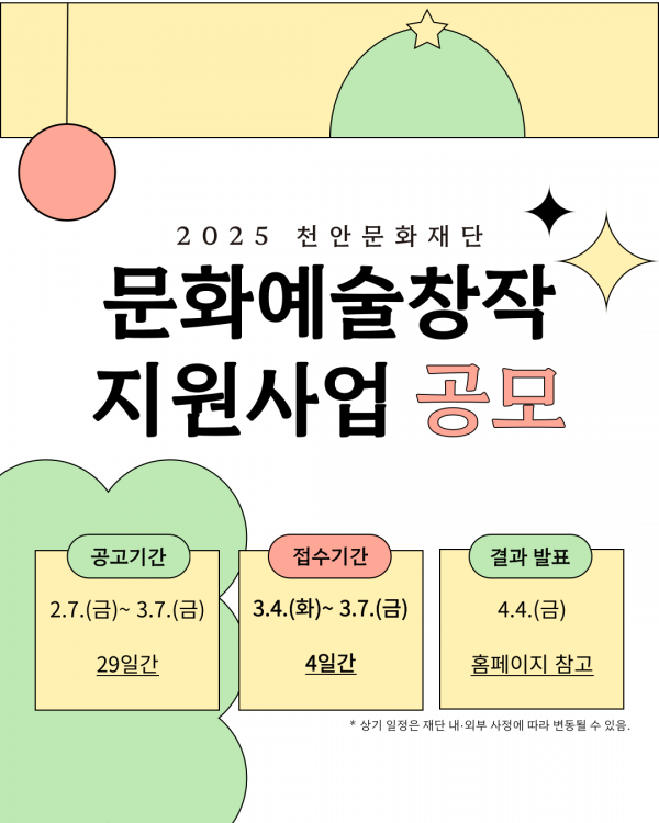 [충청25시] 천안문화재단은 오는 3월 4~ 7일 ‘문화예술 창작 지원사업’ 참여자를 모집한다고 24일 밝혔다.