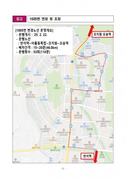 기존 1005번 버스는 대전 반석역과 은하수공원 구간을 운행했으나 이번 노선 변경으로 아름동은 물론 조치원과 오송역까지 운행 구간을 연장한 것이다.