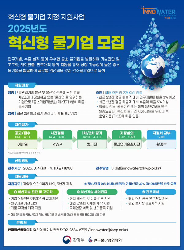 [충청25시] 환경부는 세계적인 물기업 육성을 위해 3월 4일부터 4월 11일까지 공모를 진행해 제6기 혁신형 물기업 10곳을 선정한다.