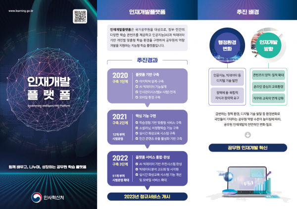 인재개발플랫폼은 정부와 민간의 다양한 자료를 온라인으로 볼 수 있는 학습 중추로 인공지능과 빅데이터를 기반으로 맞춤형 학습을 지원한다.