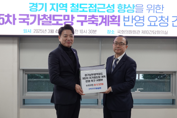[충청25시] 부승찬 국회의원은 4일 국토교통부 고위 관계자를 만나 수지 주민 4,512명의 서명지를 전달하며 “경기남부 및 용인수지의 교통난 해소와 지역균형발전에 필수적인 경기남부광역철도는 제5차 국가철도망 구축계획에 반드시 반영해야 한다”고 말했다.