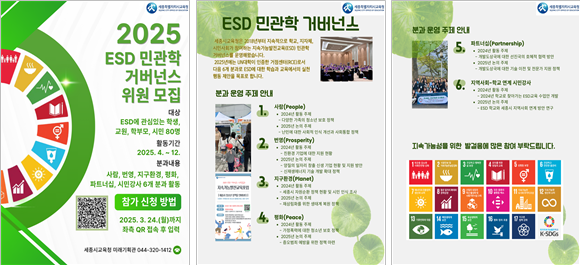 기타 자세한 사항은 아래 포스터의 정보무늬와 세종시교육청 지속가능발전교육누리집을 참고하거나, ‘2025 지속가능발전교육 민·관·학 거버넌스’ 모집 담당자에게 문의하면 안내를 받을 수 있다.