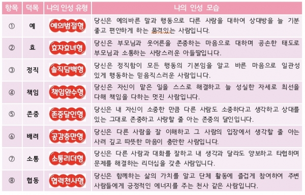 이를 통해 긍정적인 인성 역량은 칭찬과 격려로 강화해 자존감을 높이고 성장이 필요한 인성 역량에 대해서는 실천 과제를 스스로 정해 실행함으로써 학생 주도의 인성교육 토대를 마련한다.