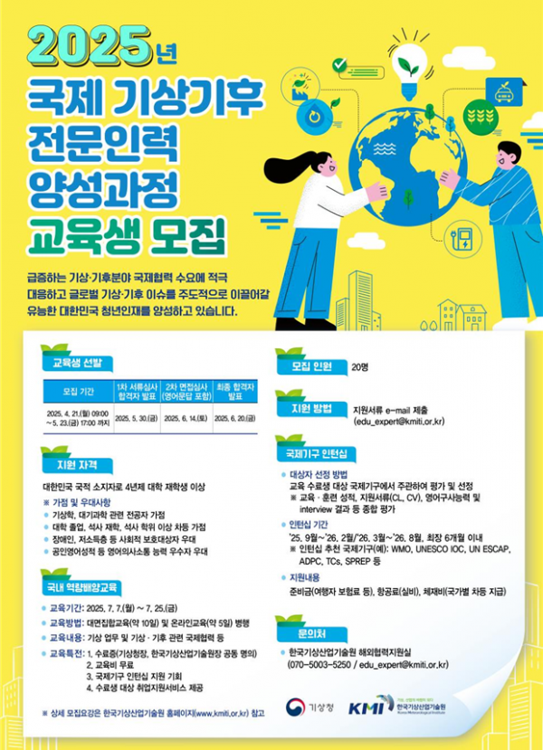 [충청25시] 기상청은 전 세계적인 기상기후 문제 해결과 지속가능한 미래를 선도할 대한민국 청년 인재를 양성하기 위해 2025년 국제 기상기후 전문인력 양성 과정 교육생을 모집한다.