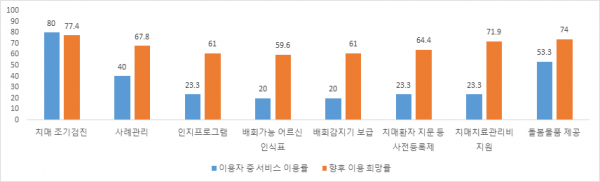또한 지역사회 거주 치매 환자의 치매안심센터 서비스 이용률은 치매조기검진이 80%로 가장 높았고 향후 이용 희망률은 치매조기검진 77.4%, 돌봄물품 제공 74%, 치매치료관리비 지원 71.9% 순으로 응답했다.