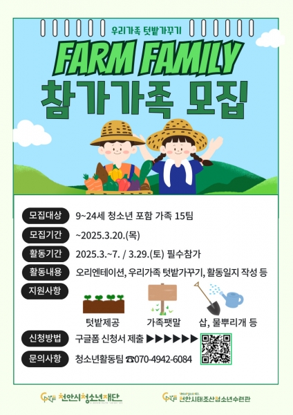 [충청25시] 천안시청소년재단 천안시태조산청소년수련관이 오는 20일까지 가족텃밭 가꾸기 프로그램 ‘FARM FAMILY’ 참가 가족을 모집한다.