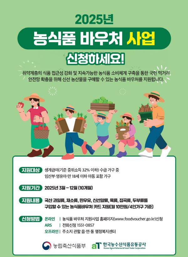 2025년 농식품바우처사업은 전국 시행에 따라 신청 대상자 기준이 지난해와 달라졌으며 ‘임산부, 영유아, 18세 이하 아동이 포함된 생계급여 수급 가구’를 대상으로 지원이 이뤄진다.