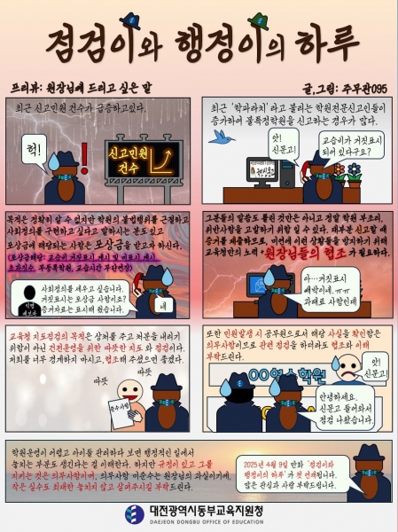 대전동부교육지원청 정진성 평생교육체육과장은“‘점검이와 행정이의 하루’는 점점 증가하는 민원 및 신고 등을 예방하기 위한 팀원들의 노력이 담겨있다.