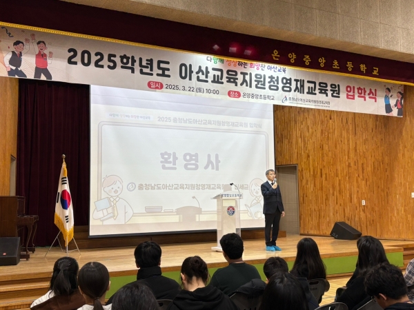 [충청25시] 충청남도아산교육지원청은 지난 22일 온양중앙초등학교 가온관에서 신입생 및 학부모, 영재교육 담당 강사 등 500여명이 참석한 가운데 2025학년도 아산교육지원청 영재교육원 입학식을 가졌다.
