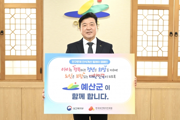 [충청25시] 최재구 예산군수가 지난 24일 보건복지부와 한국보건복지인재원 주관으로 기획된 ‘인구문제 인식개선 릴레이 캠페인’에 동참했다.