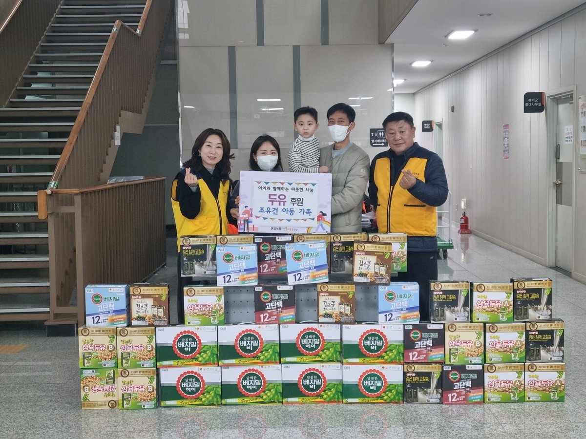 [충청25시] 조유건 아동 가족이 자녀의 다섯돌을 맞아 지난 9일 온양6동 행복키움추진단에 취약계층을 위한 후원 물품을 전달했다.