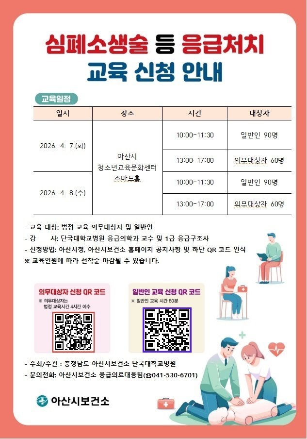 교육 신청은 아산시청과 아산시보건소 홈페이지 공지사항의 ‘2026년 심폐소생술 등 응급처치 교육 안내’에서 확인할 수 있다.