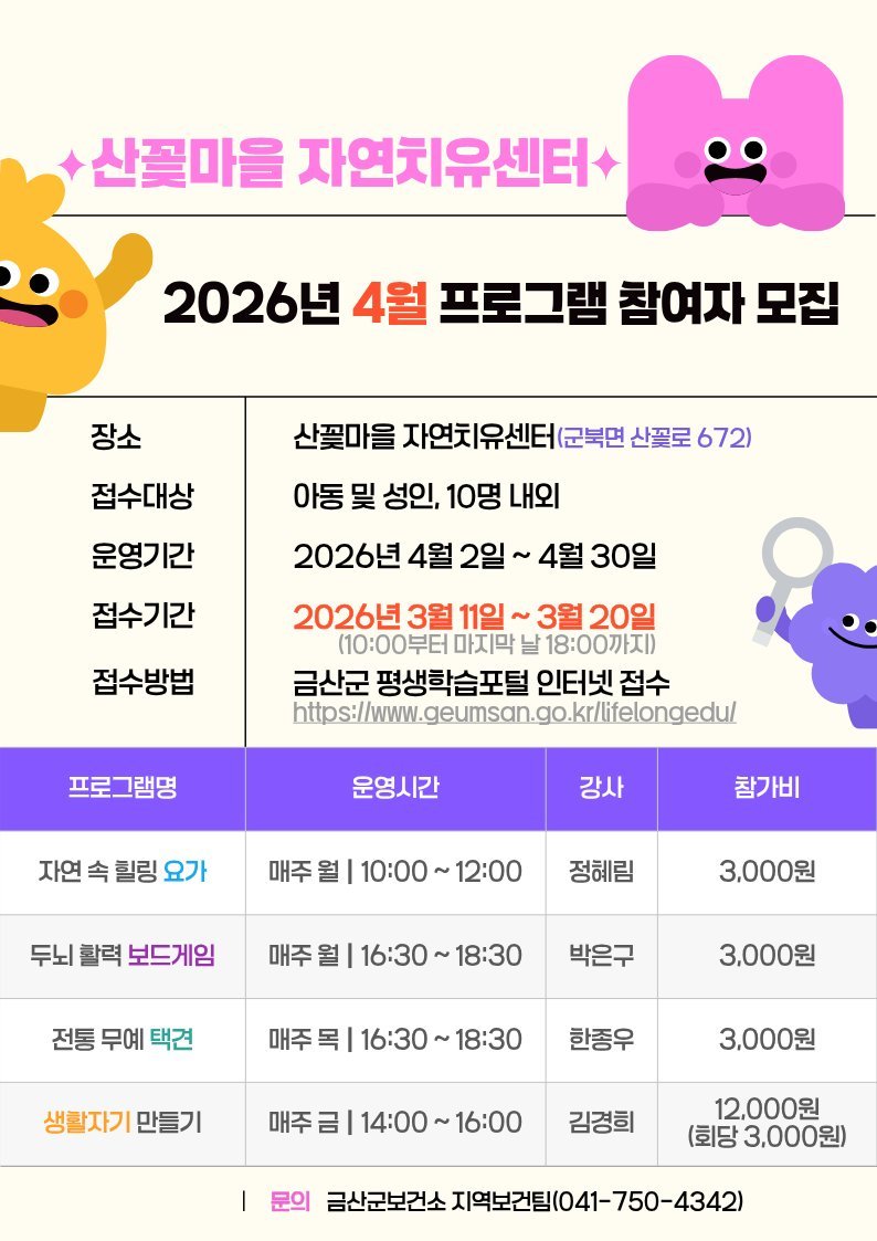 [충청25시] 금산군은 지역 주민의 건강 증진과 여가 활성화를 위해 3월 11일부터 20일까지 산꽃마을 자연치유센터 2026년 4월 프로그램 참여자를 프로그램별로 8명에서 12명까지 모집한다.