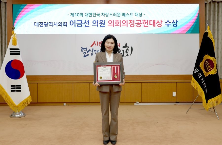 [충청25시] 대전광역시의회 이금선 교육위원장이 교육 분야 의정활동과 지역사회 발전을 위한 노력 등을 인정받아 '2026년 제10회 대한민국 자랑스러운 베스트대상 시상식'에서 '의회의정공헌대상'을 수상했다.