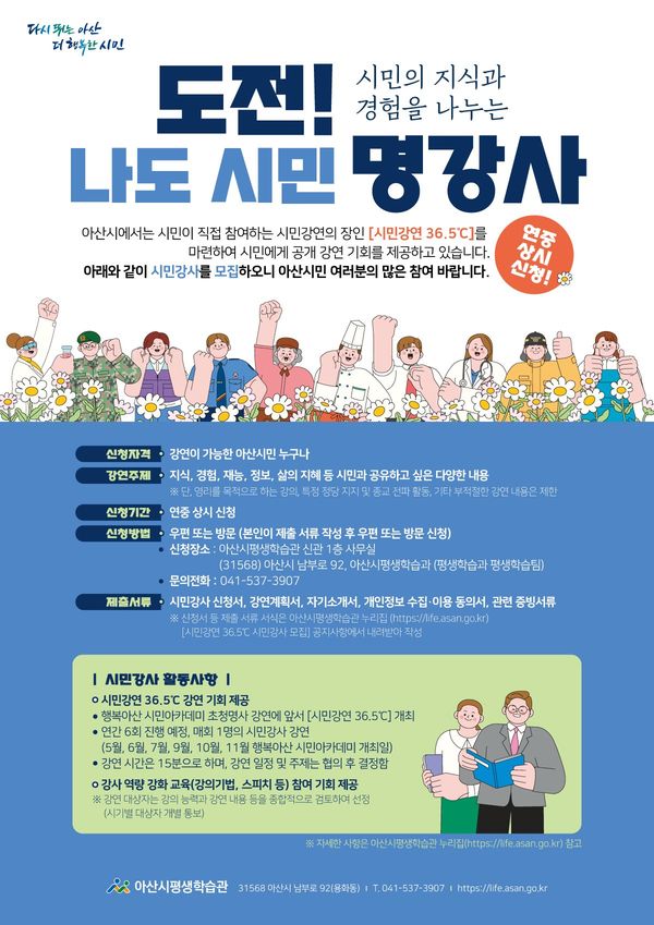 [충청25시] 아산시는 시민 각자의 지식과 삶의 이야기를 공유하는 참여형 프로그램 시민강연 36.5 에 함께할 시민강사를 모집한다.