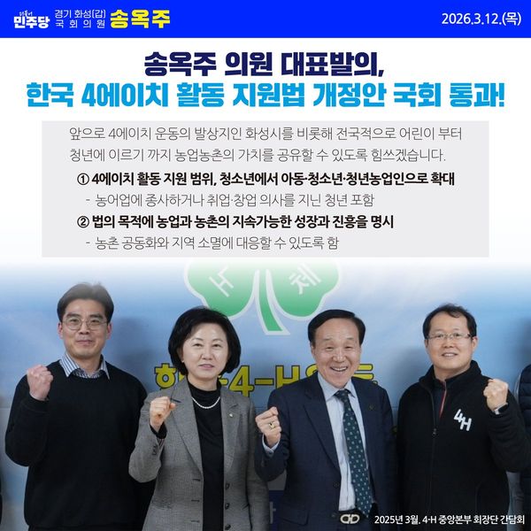 송옥주 의원은 "1945년 화성시에서 비롯한 4에이치운동은 지 덕 노 체"의 4가지 이념을 생활 속에서 실천하도록 하는 농업과 환경에 대한 이해를 드높이는 교육 운동으로 수많은 지도자를 배출해 왔다"면서"이번에 4에이치 활동 지원 범위를 청소년에서 어린이, 청년으로까지 확대하고 법의 목적에 지속가능 농업 농촌을 명시함으로써 4에이치 운동이 지역소멸에 대응하는 국민운동으로 저변을 확대할 수 있는 계기를 만들었다"고 밝혔다. 한편 4에이치 활동은 "지 덕 노 체"의 4가지 이념을 생활 속에서 실천하도록 하는 농업과 환경에 대한 이해를 드높이는 교육 운동이다.