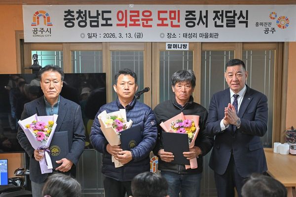[충청25시] 공주시는 지난 13일 정안면 태성리 마을회관에서 공동체 안전을 위해 헌신적인 행동을 보인 시민 3명에게 ‘충청남도 의로운 도민 증서’를 전달했다.