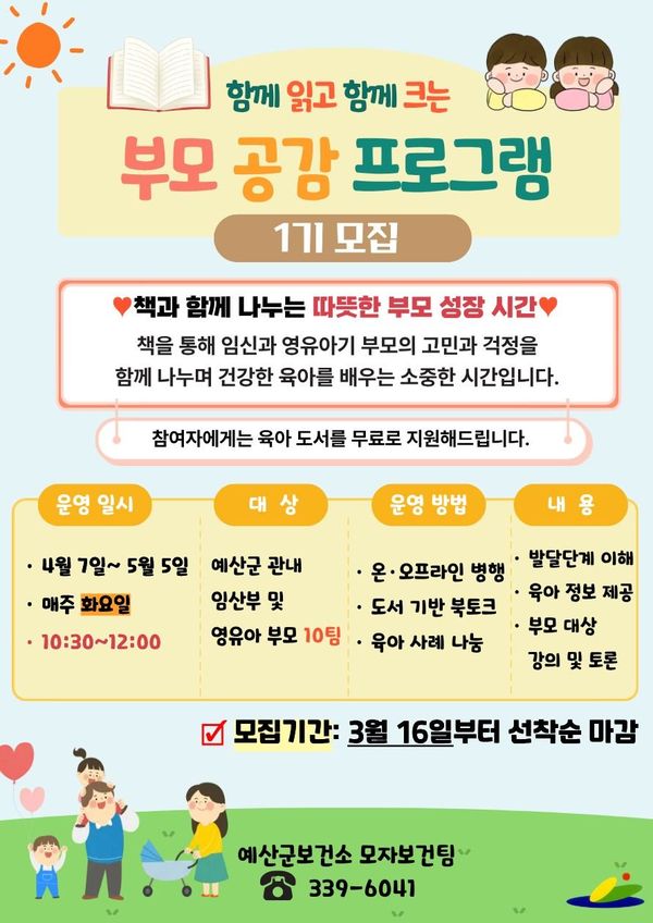 [충청25시] 예산군보건소는 임신부와 영유아 부모의 건강한 양육 역량 강화를 위해 ‘함께 읽고 함께 크는 부모공감 프로그램’1기 참여자를 16일부터 모집한다고 밝혔다.