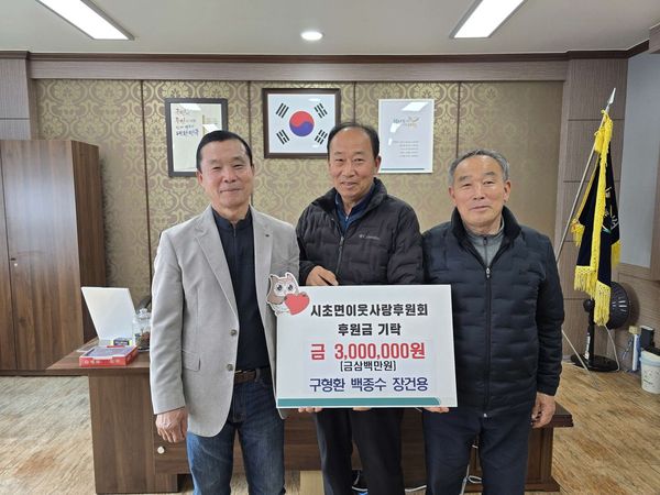 [충청25시] 서천군 시초면에 거주하는 구형환 백종수 장건용 씨가 각 100만원씩 뜻을 모아 총 300만원을 시초면이웃사랑후원회에 기탁하며 지역사회를 위한 따뜻한 나눔을 실천했다.