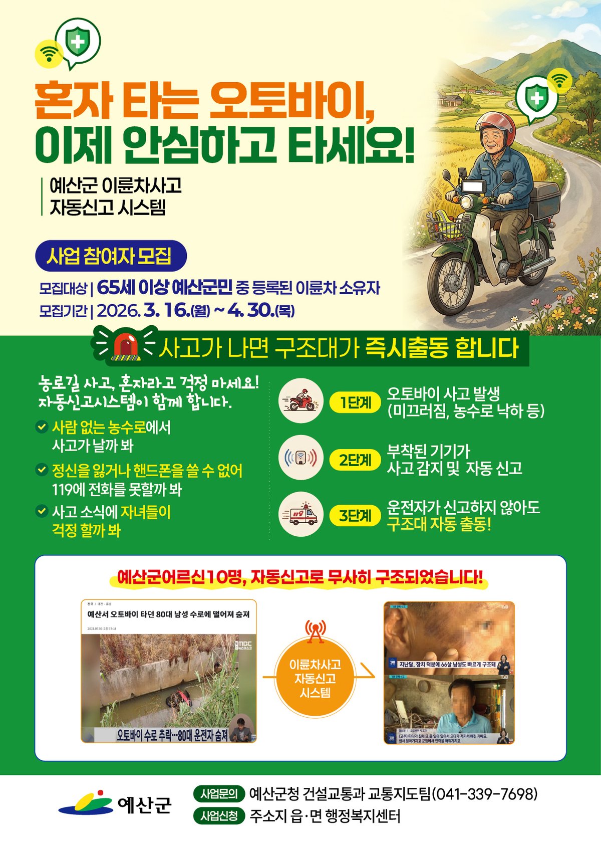[충청25시] 예산군은 이륜차사고 발생 시 자동 신고를 통해 신속한 구조를 지원하는 ‘이륜차사고 자동신고 시스템 운영’사업을 추진한다.