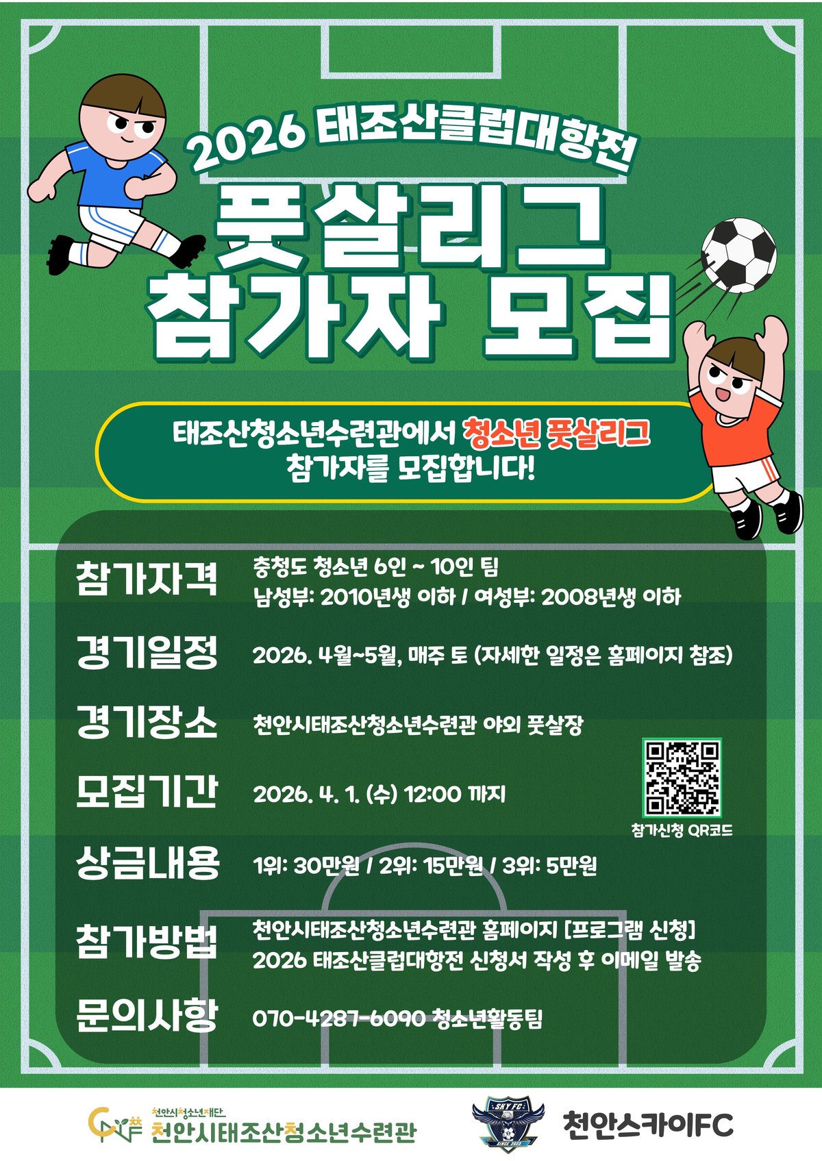 [충청25시] 천안시청소년재단 산하 천안시태조산청소년수련관은 청소년의 건강한 여가 활동과 스포츠 참여 기회를 확대하기 위해 ‘2026 태조산 클럽대항전 풋살리그’ 참가팀을 모집한다고 20일 밝혔다.