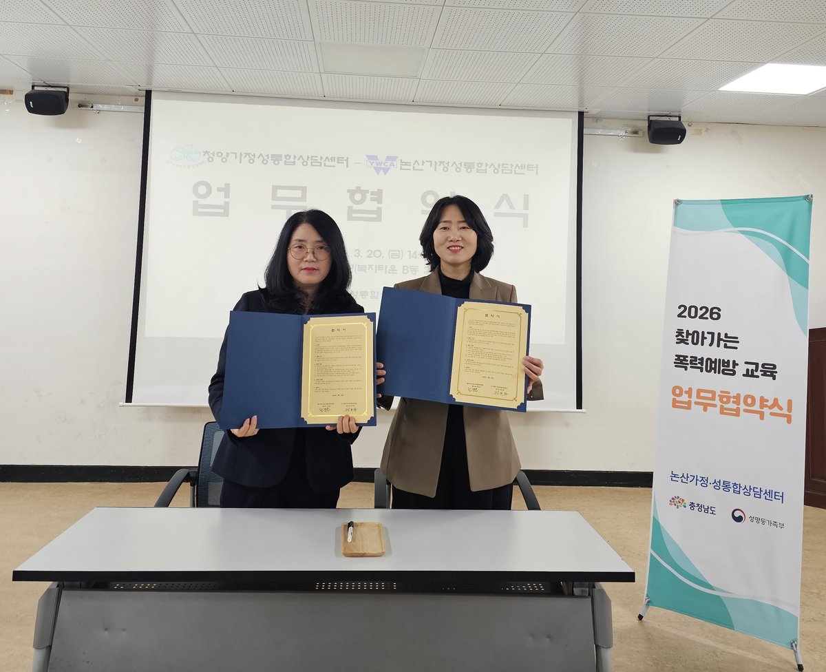 [충청25시] 청양가정성통합상담센터는 지역 내 폭력 예방과 안전한 지역사회 조성을 위해 지난 20일 청양복지타운 여성회관에서 논산가정성통합상담센터와 업무협약을 체결했다고 밝혔다.