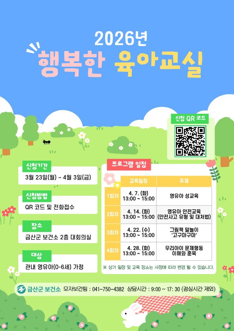 [충청25시] 금산군보건소는 관내 예비 부모 및 6세 이하 자녀를 둔 부모를 대상으로 4월 7일부터 28일까지 행복한 육아교실을 개최한다.