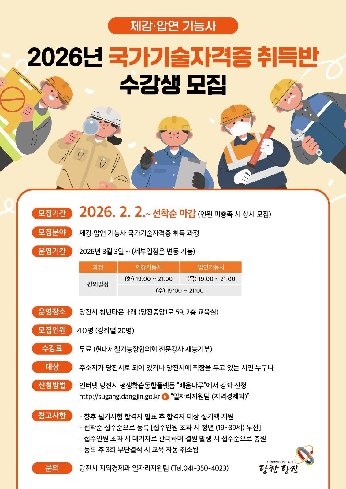 [충청25시] 당진시는 지역 인재의 직무 역량 강화와 취업 경쟁력 제고를 위해 ‘2026년 국가기술자격증 취득 반’ 수강생을 수시 모집한다고 23일 밝혔다.
