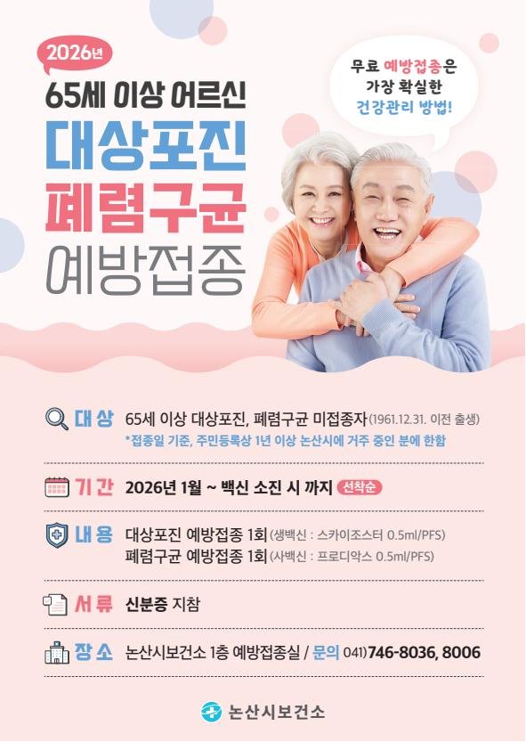 접종 대상은 접종일 기준 논산시에 1년 이상 주민등록을 둔 만 65세 이상 시민으로 기존 접종 이력이 있거나 백신 금기자는 제외된다.