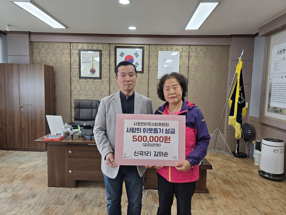 [충청25시] 서천군 시초면 신곡1리에 거주하는 김의순 씨가 최근 시초면이웃사랑후원회에 성금 50만원을 기탁하며 지역사회에 따뜻한 나눔을 실천했다.