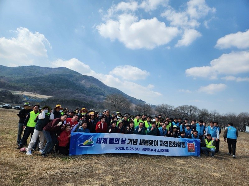 [충청25시] 예산군은 지난 25일 예당저수지 일원에서 관내 사회 환경단체와 한국농어촌공사 예산지사, 예당내수면어업계, 공무원 등 110여명이 참여한 가운데 ‘세계 물의 날’을 기념한 자연정화활동을 펼쳤다.
